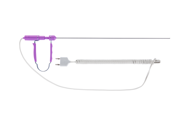PA国际厅科技的高频内窥镜手术电极可360°旋转操作,前端工作部分角度≤45°。搭配RFS-4000KD设备输出频率1.71MHz使用,时间更短,消融效果更好。